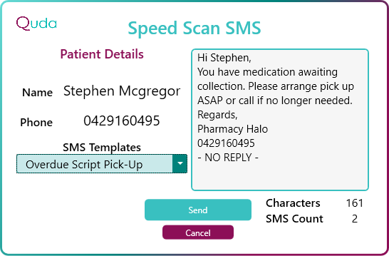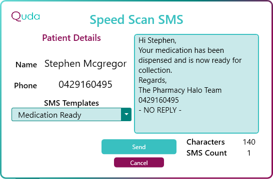 The patient’s name and phone number (and item name, if the template uses this) get pulled across automatically from your dispensary software, filling the necessary fields given the SMS template you’ve selected. You are also free to make any finer edits to the SMS as you wish before clicking Send to send it to the patient.