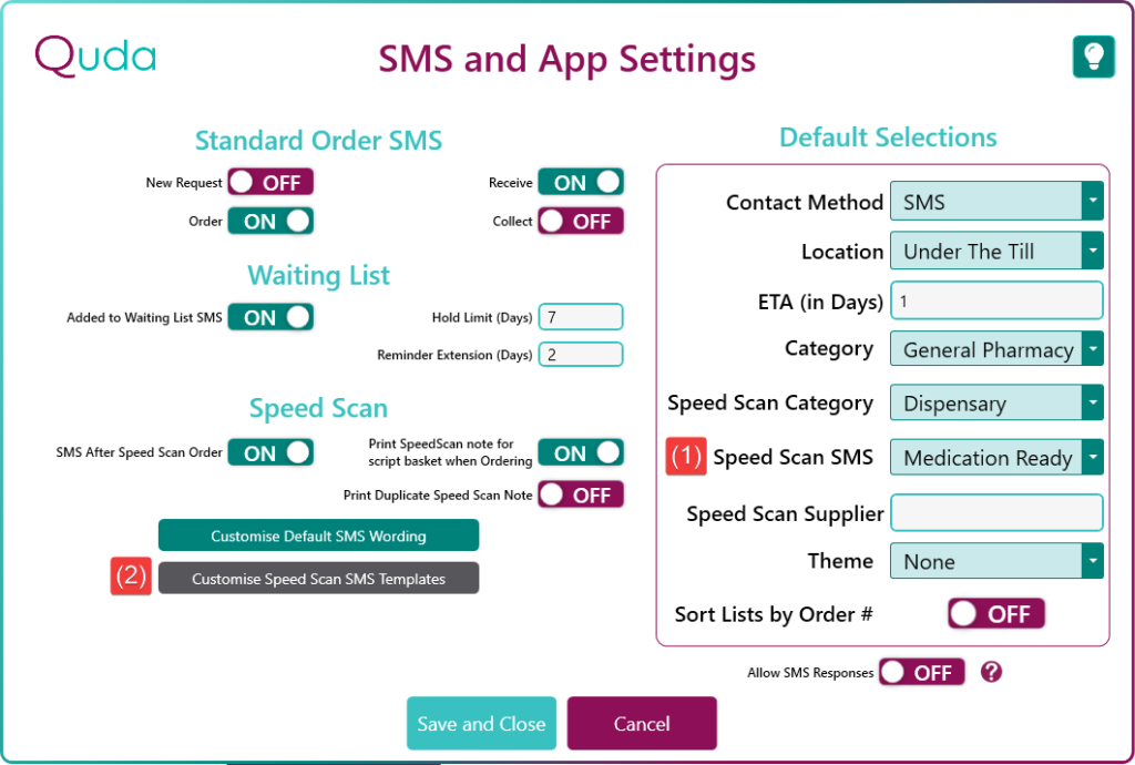 (1) : If there’s a specific SpeedScan SMS template that your pharmacy uses more frequently than the rest, this is where you can set this template to be selected by default after scanning in a dispense label.